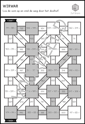 Deze download bevat een WIRWAR doolhof om gratis uit te proberen. Het zijn sommen om het optellen t/m 1000 te automatiseren. Het is geschikt voor groep 5/6. Er is ook een bundel met nog eens 10 doolhoven! Kijk daarvoor op www.jufbrenn.nl. Mis niets en volg mij op Facebook & Instagram!