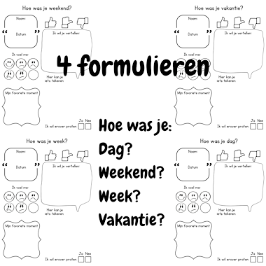 Leerling check-in: Hoe was je dag, week, weekend en vakantie ? Kom erachter hoe het met je leerlingen gaat via dit invulformulier. Leerlingen kunnen duimpjes omhoog, opzij of naar beneden kleuren. Dingen met je delen en smileys inkleuren hoe ze zich voelen. Daarnaast is er een check-box waarin leerlingen kunnen aangeven of ze er over willen praten. Wat je krijgt: – 1 PDF met 4 bladzijdes/formulieren (dag, week, weekend en vakantie) – 1 PDF met een bedank bericht