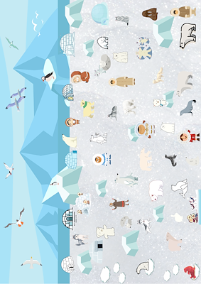 Themabundel ijsberen: - ijsblokjessjoelen - sneeuwvlokkenlotto - proefje met ijs - beginklank "w" woordkaartjes prent en foto (lees- en hoofdletters) -pooldieren stapelen - zoekspel