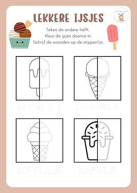 Deze lekkere ijsjes zijn maar voor de helft getekend. Kan jij ze verder afwerken? En kan je ook de woorden overtrekken of na stempelen, schrijven? digitale spelbundel met - speel-werkblaadjes met gradatie teken de andere helft, met voorbeeld teken de andere helft, zonder voorbeeld overschrijf de woorden - spelidee - doelen Zill en OVSG Alles zit ook in aparte documenten. Druk enkel af wat je nodig hebt. meer leuks op: www.littleplayfriends.com