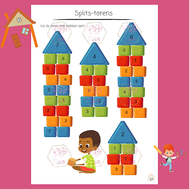 In deze bundel leren de kinderen stap voor stap splitsen tot 10. Er zijn vier onderdelen Deel 1 ‘Ik leer splitsen’ (via figuren, getalbeelden en uiteindelijk getallen zelf leren splitsen) Deel 2 ‘Ik oefen de splitsingen tot 10’ (via leuke blaadjes het splitsen oefenen) Deel 3 ‘Ik daag me uit’ (splitsen in 3 delen) Deel 4 ‘Ik race’ (automatiseren: 10 blaadjes met elk 20 splitsoefeningen)