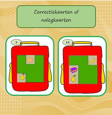 Smartgame • 14 opdrachtkaarten • 14 zelfcorrectiekaarten • 1 spelbord • 4 afdekfiguren Hoe werkt het? • Het spelbord bestaat uit een boekentas met 9 voorwerpen • De opdrachtkaarten tonen welke voorwerpen er moeten overblijven als de boekentas bedekt wordt met een afdekfiguur • De zelfcorrectiekaarten kunnen ook gebruikt worden als nalegkaarten