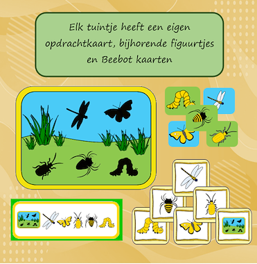 Beebotspel Kriebeldiertjes - Kies een tuintje - Zoek de juiste opdrachtkaart ( dezelfde kleur als de kader) - Start de Beebot op dit plaatje - Programmeer de Beebot naar de volgende afbeelding op je opdrachtkaart - Indien je correct bent aangekomen mag je deze op de goeie plaats in je tuintje plaatsen. Ga naar de volgende afbeelding. Of start opnieuw bij je tuintje. - Wie eerst zijn tuintje kan vullen heeft gewonnen - Niet op het juiste plaatje terecht gekomen, beurt voorbij