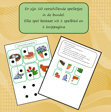 Busybook Thema Lente Deze bundel bevat 10 verschillende spelletjes. 2X Tellen, schaduwbeelden, puzzelen, zoek hetzelfde boeket, seriëren, wat is weg, reeksen vervolledigen, matrix en sudoku • Elk spelletje past op 1 pagina (+ 1 knipblad) • Lamineer de spelpagina en de uitgeknipte figuurtjes • Kleef velcro op de aangeduide plaatsen • Tip: plaats steeds de zachte velcro op het spelblad en de kleef haakjes op de figuurtjes. Zo blijven de pagina’s niet aan de mouwen van de kinderen kleven.