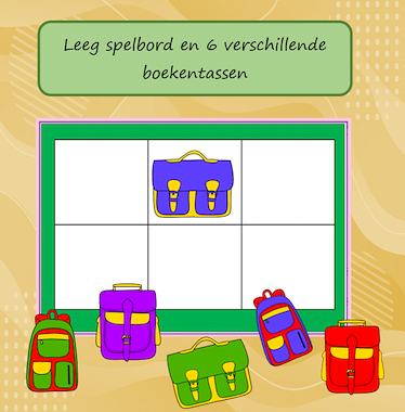 Thema Weer naar school Plaats de boekentassen op de juiste plaats in het rooster. * Leeg rooster en 6 boekentassen * 18 opdrachtkaarten * 18 zelfcontrolekaarten (ook te gebruiken als nalegkaarten) * 3 verschillende niveaus