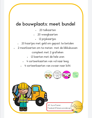 In deze vrolijk geïllustreerde bundel vind je diverse activiteiten rond de bouwplaats / bouwen, gericht op de leerlijnen rond meten: 20 telkaarten waarop een muur gebouwd wordt, 20 weegkaarten, gepast betalen tot en met 12 euro, klokkijken met hele uren, meten met klikkubussen, een grafiek maken en sorteerkaarten vol-leeg en zwaar-licht. Deze bundel past perfect bij de taal bundel rond de bouwplaats, die je ook in mijn winkeltje kunt kopen.